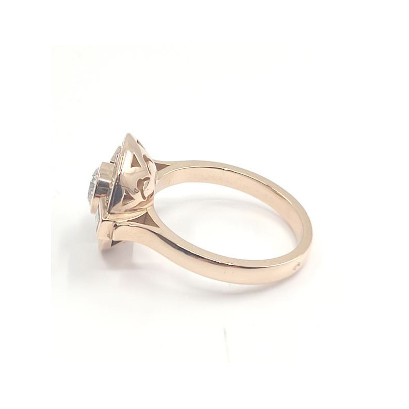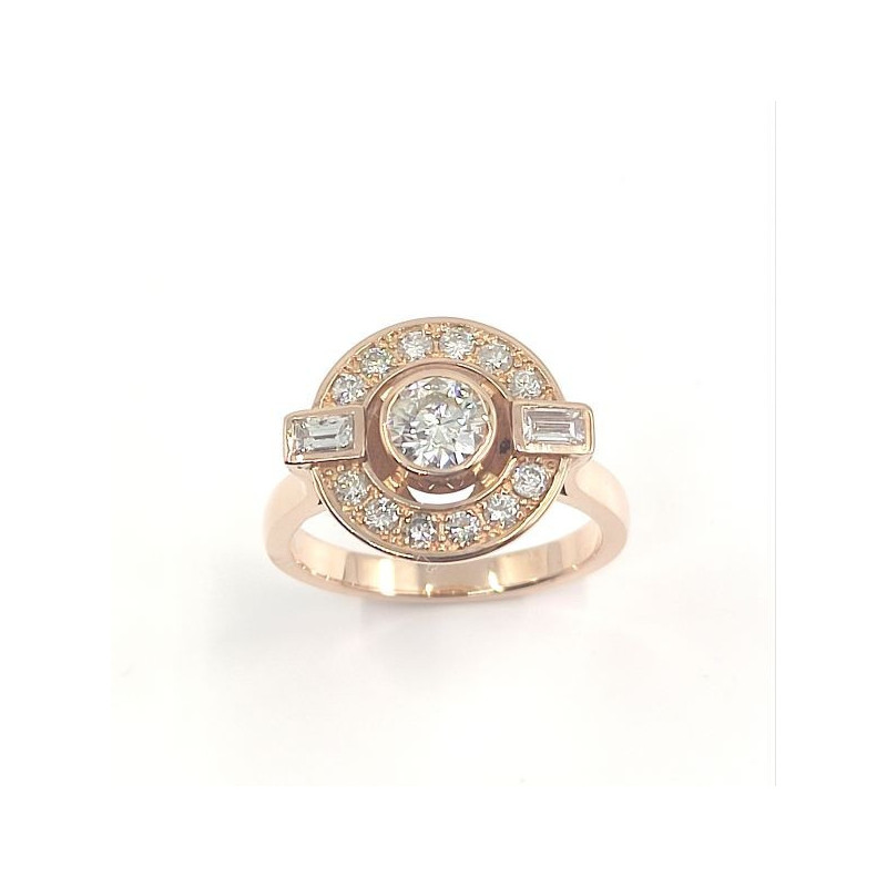 Cette bague diamants Rosy avec un modèle totalement rétro. Sa pierre de centre est un diamant rond (Brillant) de 0,43 ct de couleur G et de pureté SI2. Elle est accompagnée de 2 diamants de forme baguette et d'un entourage de diamants ronds (Brillants) sertis sur de l'or rose 18 carats. Son design rétro tout en délicatesse est parfait pour toute femme qui souhaite une bague unique et élégante. Vous pouvez aussi la faire réaliser en or blanc ou en or jaune.