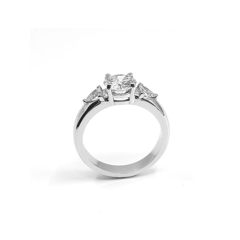 Bague diamant Belle d'Amour. Trilogie avec un diamant central rond (brillant) de 0,73 ct accompagné de deux diamants poire. Serti griffes - en or 18 carats.