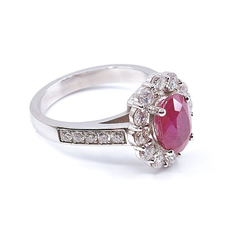 Bague or, diamants et rubis Elisabeth. Modèle intemporel marguerite en or blanc 18 carats avec un rubis central ovale de 2,10 ct, avec son entourage de 12 diamants ronds (brillant) et le demi corps serti de diamants. Elle est réalisable en or jaune ou en or rose.