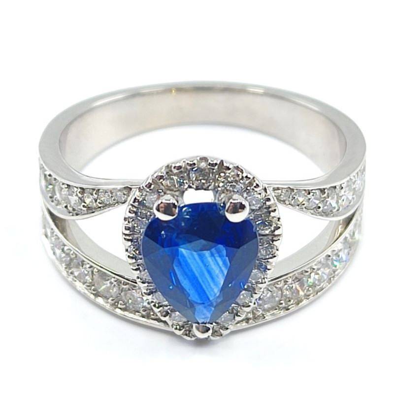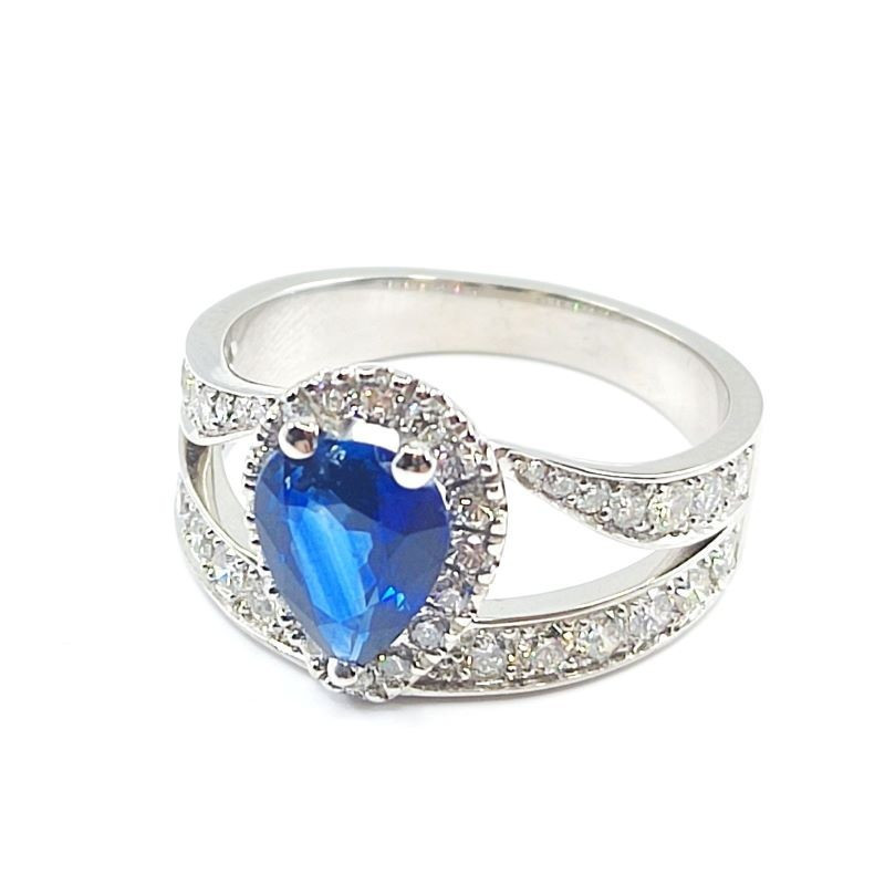 Bague saphir Perla. Saphir central de forme poire de 1,10 ct avec entourage diamants et double corps serti - en or 18 carats.