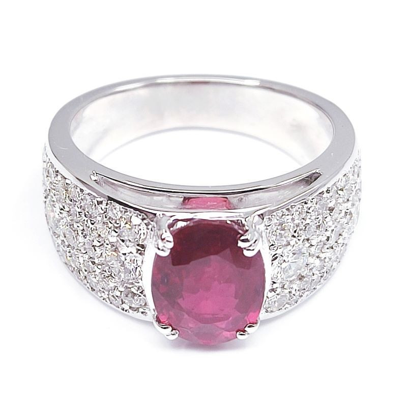 Bague rubis et diamants Volcan. Elle est sertie d'un rubis ovale de 1,81 ct sur doubles griffes ,accompagné d'un pavage de diamants pour un poids total de 1,34 ct, en or blanc 18 carats. Réalisable en or rose ou en or jaune.