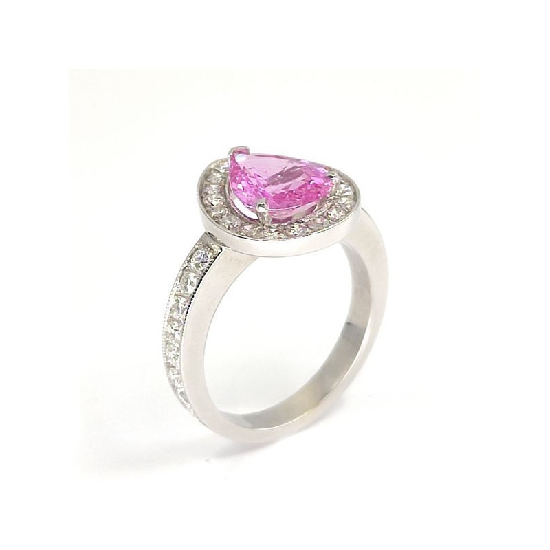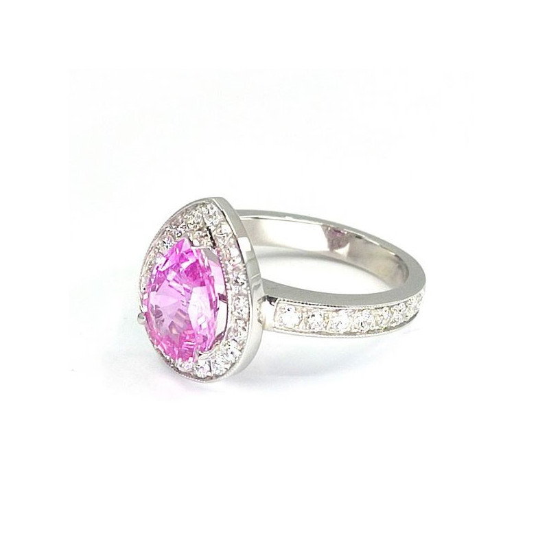 Bague saphir rose Divine: Un magnifique Saphir rose de forme poire entouré de diamants - en or 18 carats