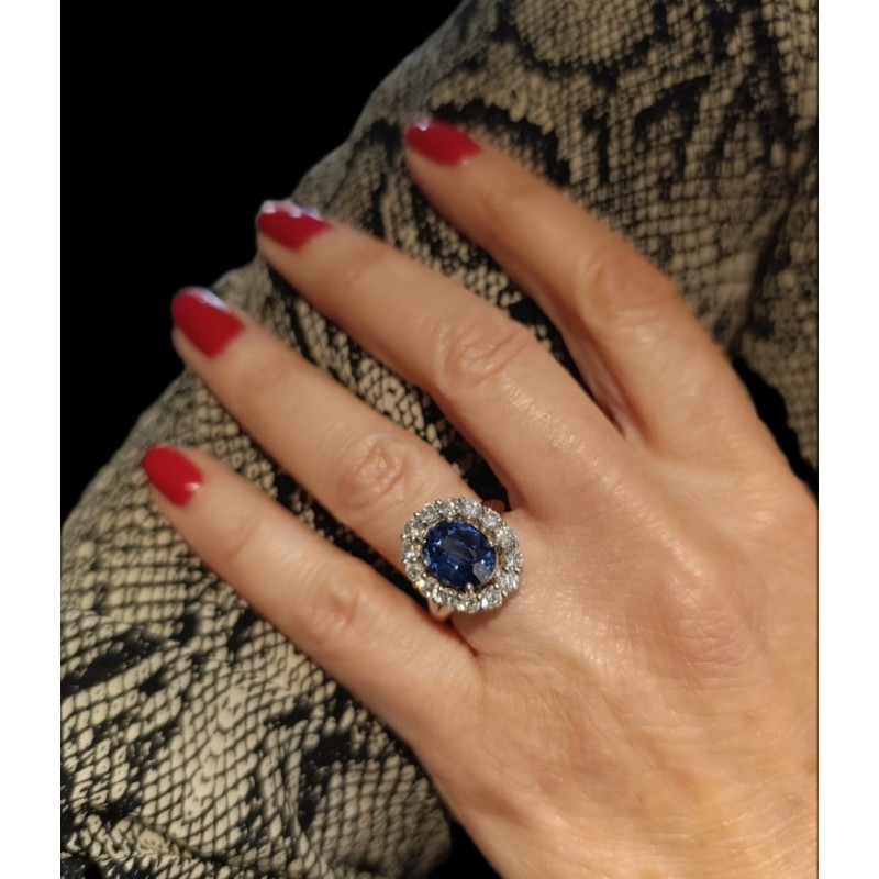 Bague saphir et diamants Hélène. Marguerite avec un saphir ovale de 3,93 ct et entourage de 14 diamants ronds - en or 18 carats.