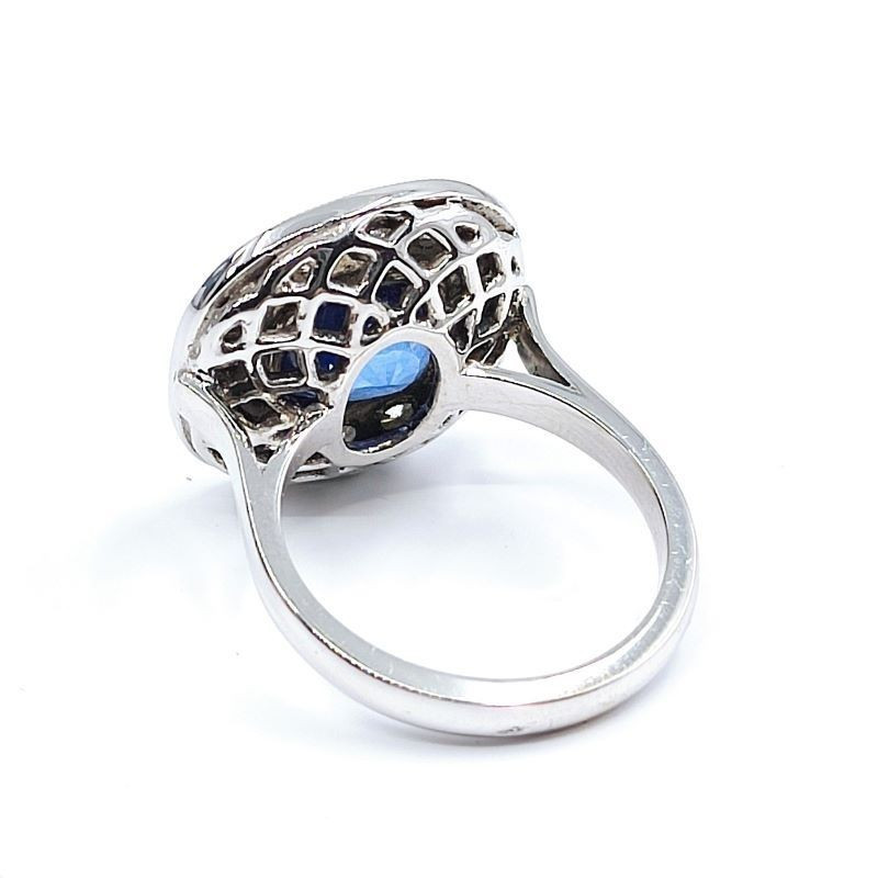 Cette bague saphir et diamants Océane est composé d'un saphir de taille coussin de 4,25 carats, accompagné d'un entourage de 1,68 ct de diamants ronds (brillants), sertis sur de l'or blanc 18 carats. Avec son joli panier ajouré et le sertissage orné d'une fine ciselure, son charme est absolument rétro. Son allure majestueuse est parfaite pour toute femme qui souhaite une bague unique et élégante. Vous pouvez la faire réaliser en or rose ou en or jaune.
