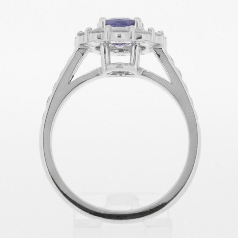 Bague or, saphir et diamants Lisbeth. Modèle intemporel marguerite en or blanc 18 carats avec un saphir central ovale de 1,33 ct, avec son entourage de 12 diamants ronds (brillant) et le demi corps serti de diamants. Elle est réalisable en or jaune ou en or rose.