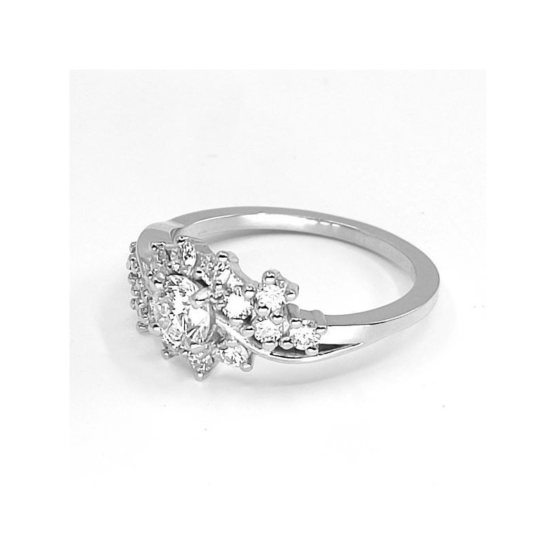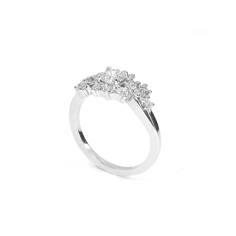 Bague diamants Amandine. Modèle très romantique avec ses volutes en or blanc 18 carats serties de diamants. Le diamant central rond ( Brillant) est de 0,46 ct, couleur G et de pureté SI1. Il est accompagné de 14 diamants disposés en vague autour de lui. Vous pouvez la faire réaliser en or jaune ou en or rose 18 carats.