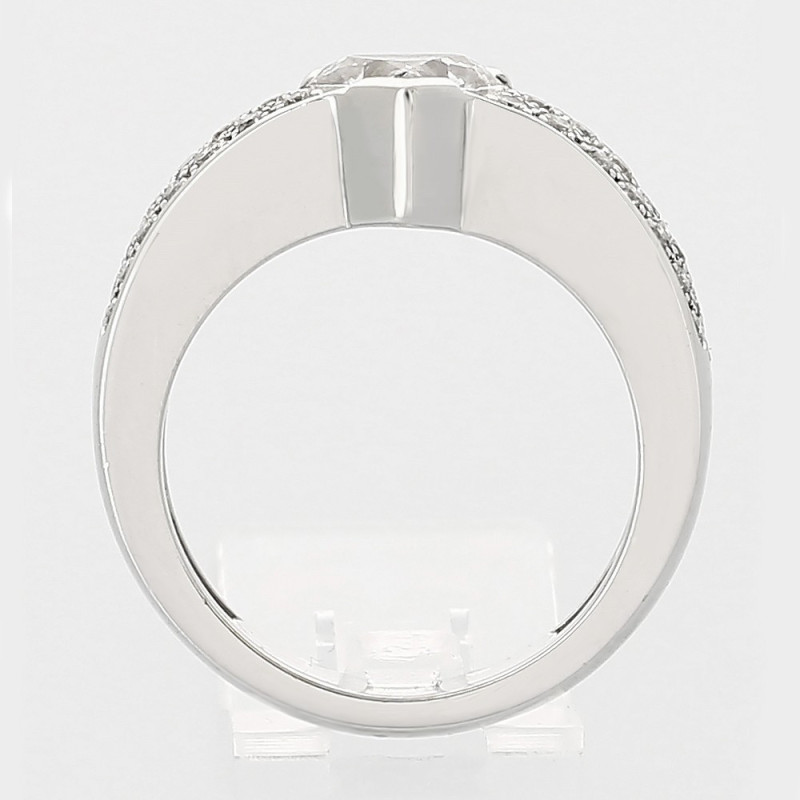 Bague en or 18 cts (750/1000e) en or gris, or jaune ou or rose. Cette bague est sertie d'un diamant central en forme de cœur de 1,00 ct en demi clos sur un pavage de 42 diamants ronds. Elle peut être réalisée en or blanc, or jaune ou or rose 18 carats.