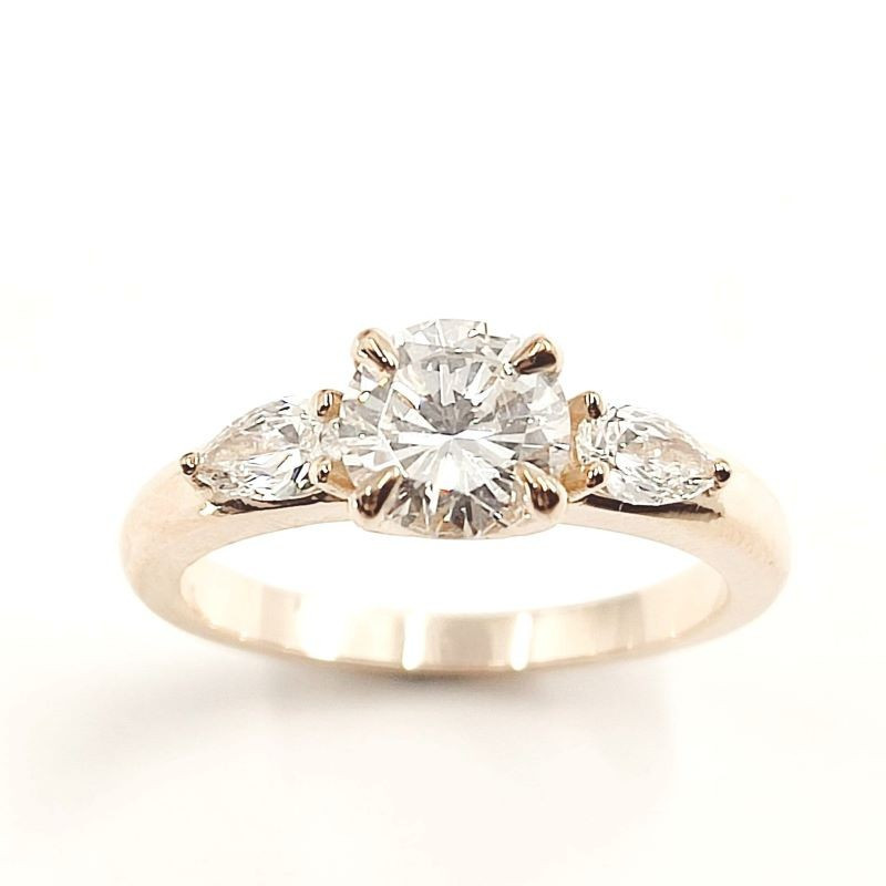 Bague diamant Belle d'Amour. Trilogie avec un diamant central rond (brillant) de 0,73 ct accompagné de deux diamants poire. Serti griffes - en or 18 carats.