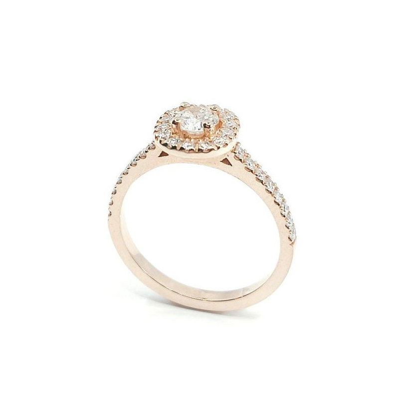 C'est une bague de fiançailles avec entourage dit coussin, sertie au centre d'un diamant central de forme ronde (taille Brillant) de 0,20 ct.