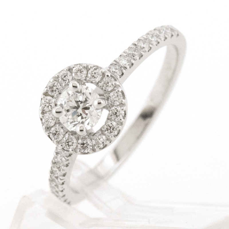 Solitaire or et diamants Pauline. Bague à entourage de forme ronde avec un diamant central de 0,40 ct - en or 18 carats.