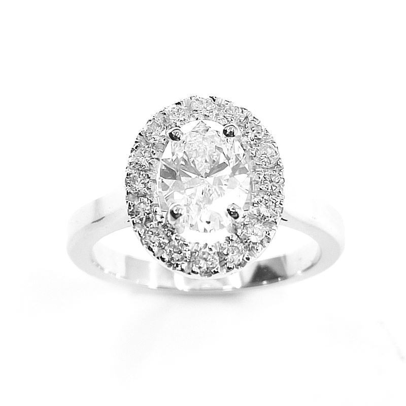 Solitaire or et diamants Ninon. Modèle à entourage serti d'un diamant ovale de 1,00 ct et entourage de diamants ronds - en or 18 carats.