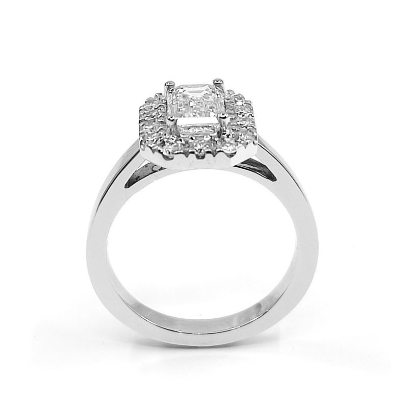 Solitaire or et diamants Sélène. Modèle rétro avec un diamant central taille émeraude de 1 ct avec entourage de diamants ronds (brillant) - en or 18 carats.