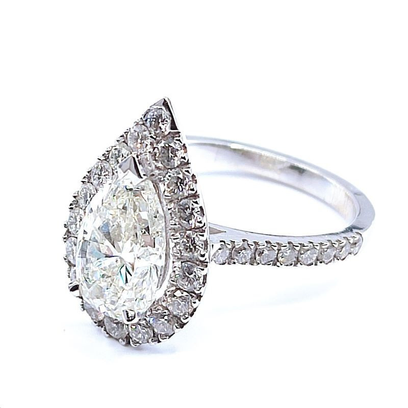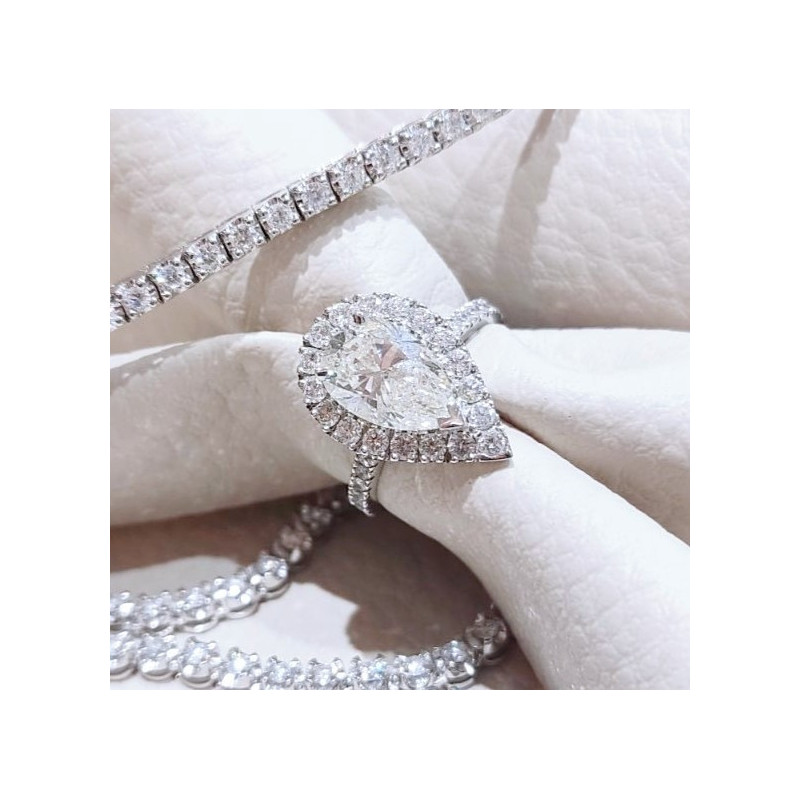 Solitaire diamants Geraldine. Serti d'un diamant taille poire de 2 carats, avec entourage et pavage de diamants ronds (Brillants) - en or 18 carats.
