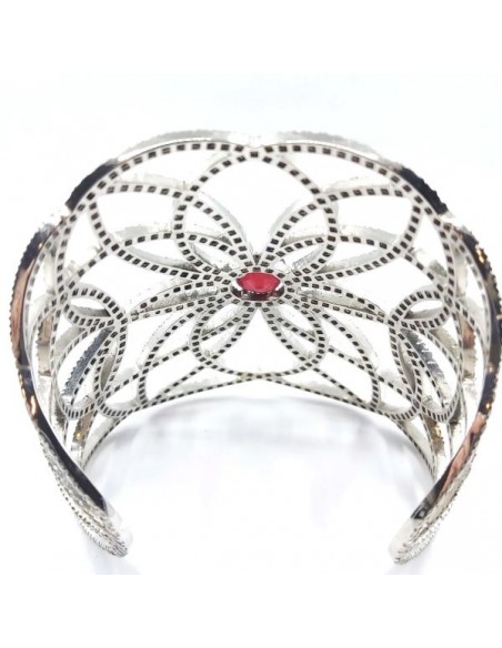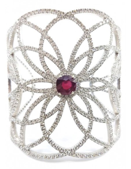 Bracelet Manchette Rosace. Pièce unique ajourée dentelle pavée de 682 diamants et ornée d'un rubis au centre. En or blanc 18 carats.