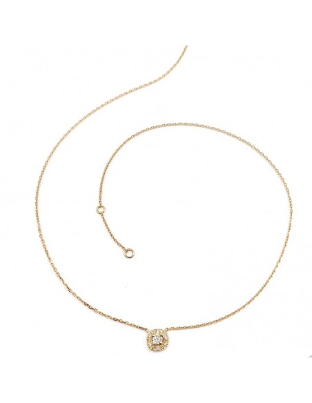Ce collier or et diamant Kelly est un collier avec un diamant rond (Brillant) de 0,29 ct avec un entourage de forme coussin pavé de diamants. Il est monté sur une chaine maille forçat diamantée de diamètre 1,2 mm et dispose d'un mousqueton avec anneau intermédiaire. Son design tout en finesse est parfait pour toute femme qui souhaite un collier simple et élégant.